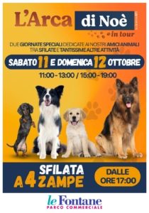 - SABATO 18 E DOMENICA 19 OTTOBRE: LA STAR SEI TU! Due giornate dedicate esclusivamente ai nostri amici animali, con sfilata a 4 zampe e tante altre attività. Il sabato 18 e la domenica 19 ottobre arriva il Tour dell’ Arca di Noè, la fortunata trasmissione televisiva targata Mediaset in onda su Canale 5. Un’ occasione unica sia per mettere in mostra il proprio animale di compagnia, ma anche per fargli vivere una giornata di divertimento e relax in compagnia…